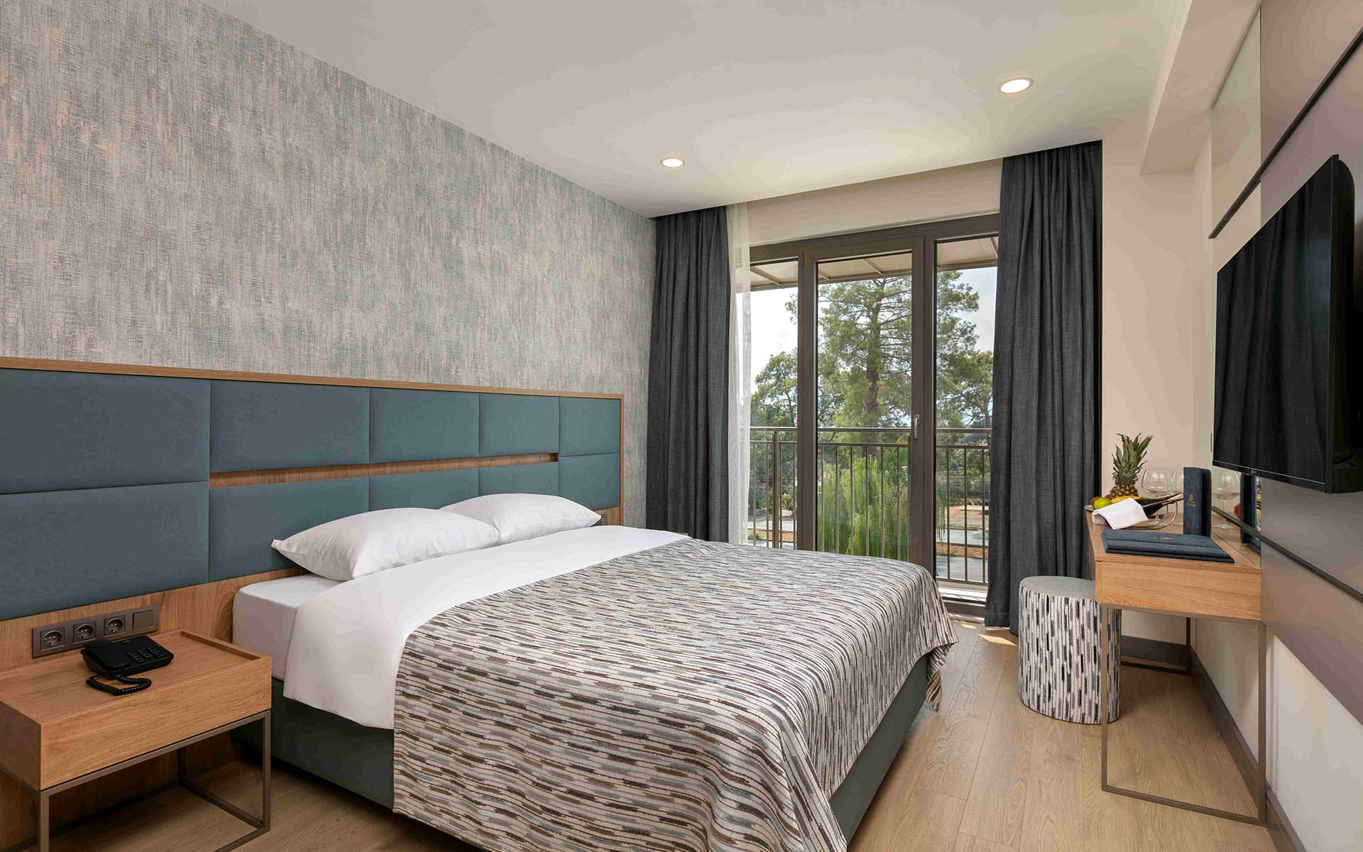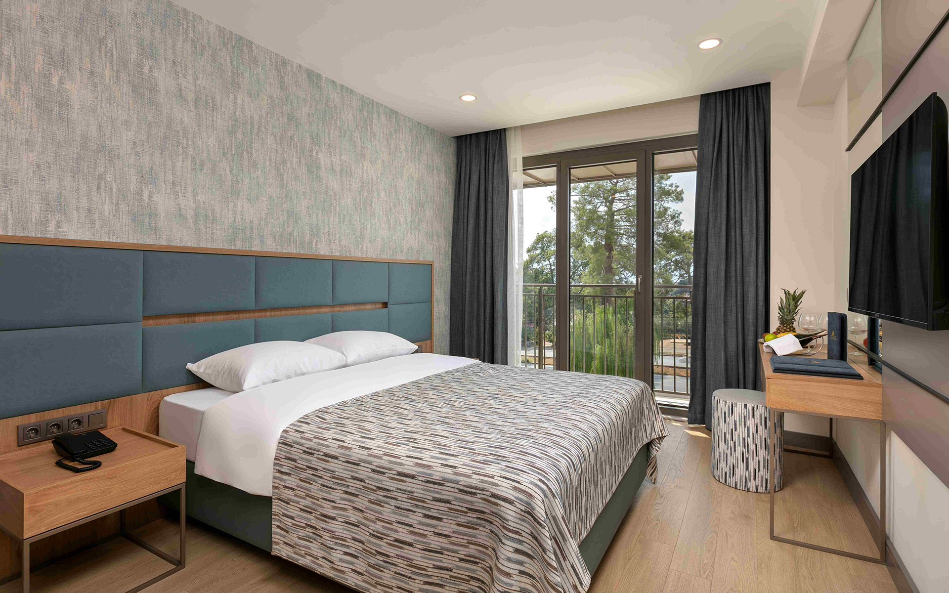Deluxe rooms are 28 m² wide. There is one double bed, one sofa bed and a balcony with a forest view. In addition, 40" 4K TV, safe box, hair dryer, mini fridge, air conditioning and a seating area for 2 people on the balconies are at your service.
